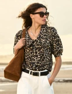 Designed with a bold animal print and short puff sleeves, this pure cotton Baukjen blouse is a standout choice. It’s cut in a comfy regular fit, with a smart button-through fastening. Delicate frills on the oversized collar add a feminine final touch.