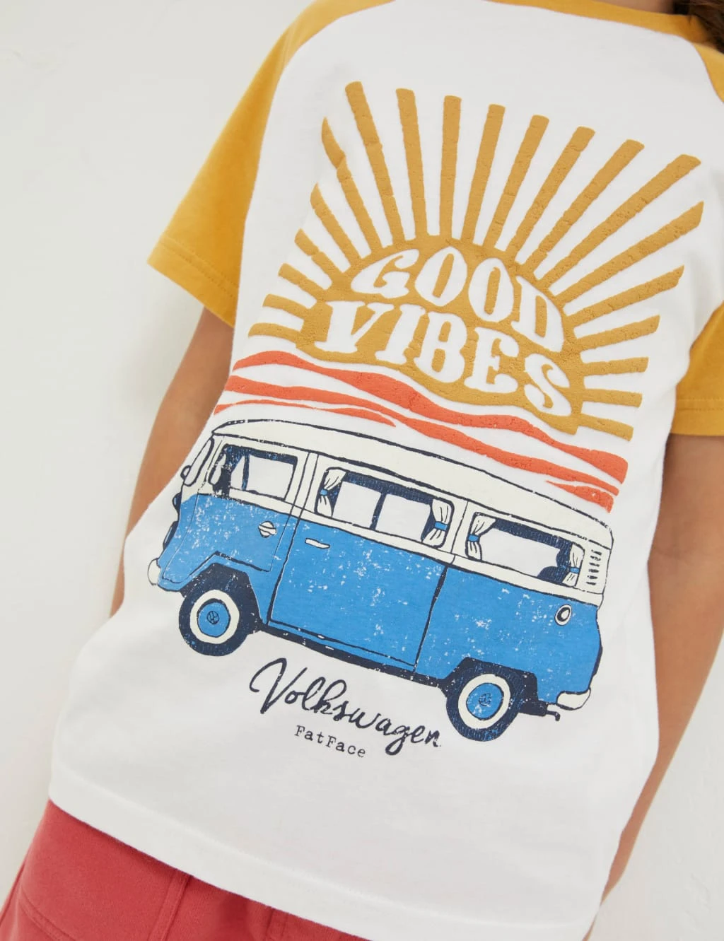 Send them off on the day’s adventures wearing this pure cotton t-shirt from FatFace. The raglan-style design is made to a regular fit with a round neckline and short sleeves in a contrasting colour. It’s complete with a ‘Good Vibes’ slogan and a cool camper van illustration.