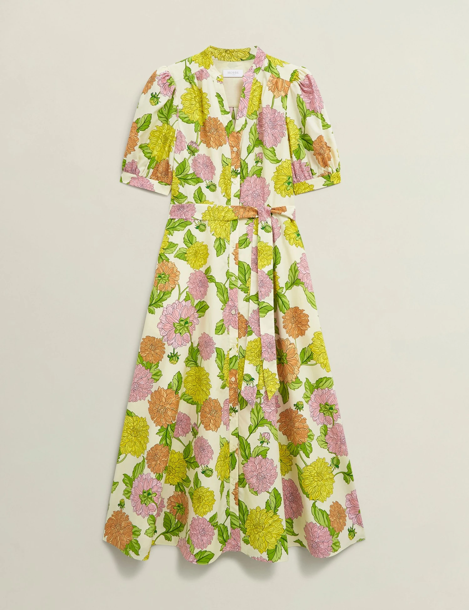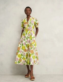 Bring a pop of brightness to your wardrobe with this pure cotton dress by Hobbs. It’s made in a comfy regular fit with a flattering skater silhouette and an elegant midi-length hemline. The bodice features a feminine notch neckline, while short puff sleeves ensure an on-trend look. An all-over floral print lends a standout finish. This piece fastens with front buttons.