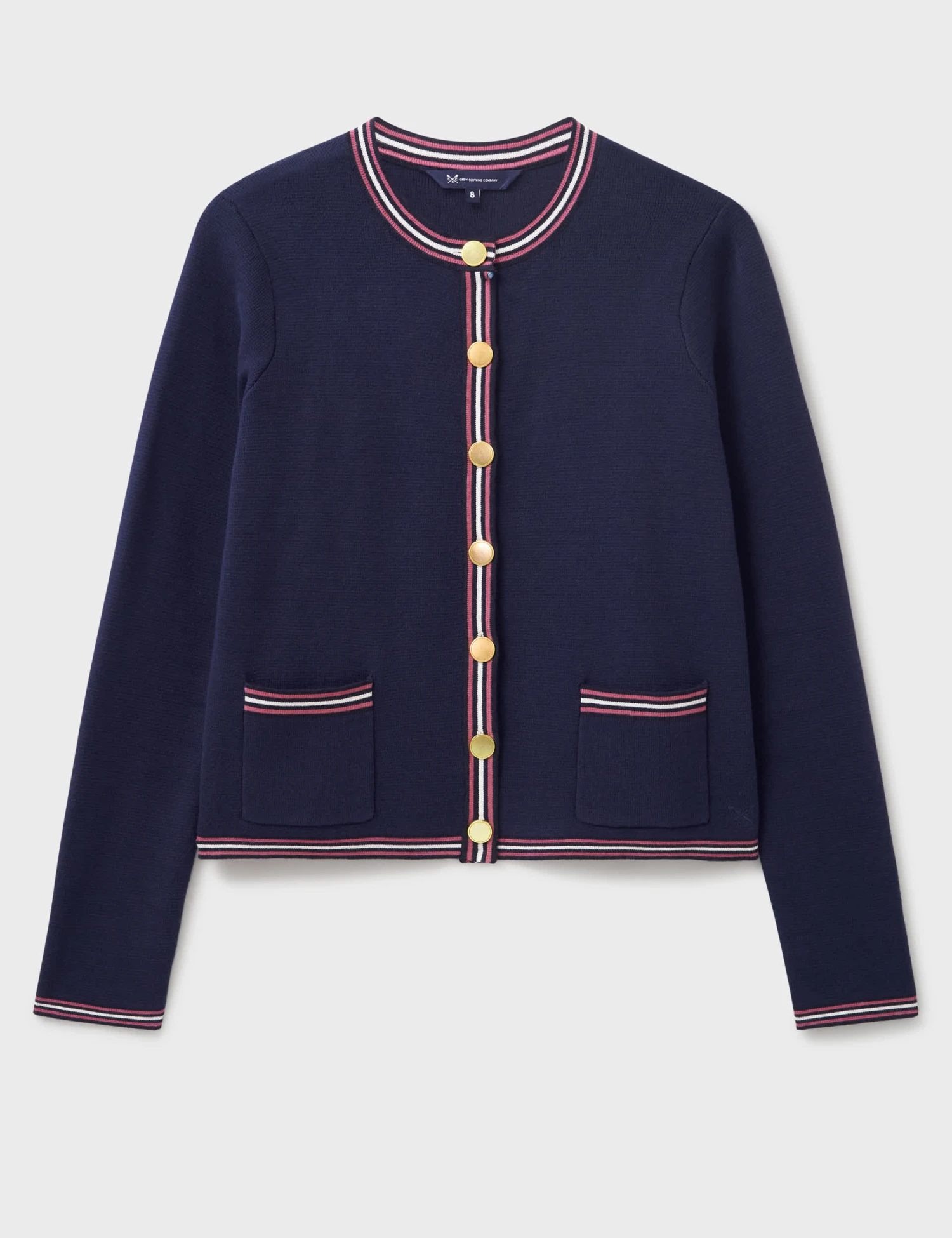 This pure cotton knitted jacket from Crew Clothing is an elegant layering piece. It’s styled in a regular fit, with a neat crew neckline and a short length for a smart silhouette. Contrast tipping on the trims provides a crisp, tailored look, while gold-tone buttons add a touch of luxury. Two front patch pockets complete the design.