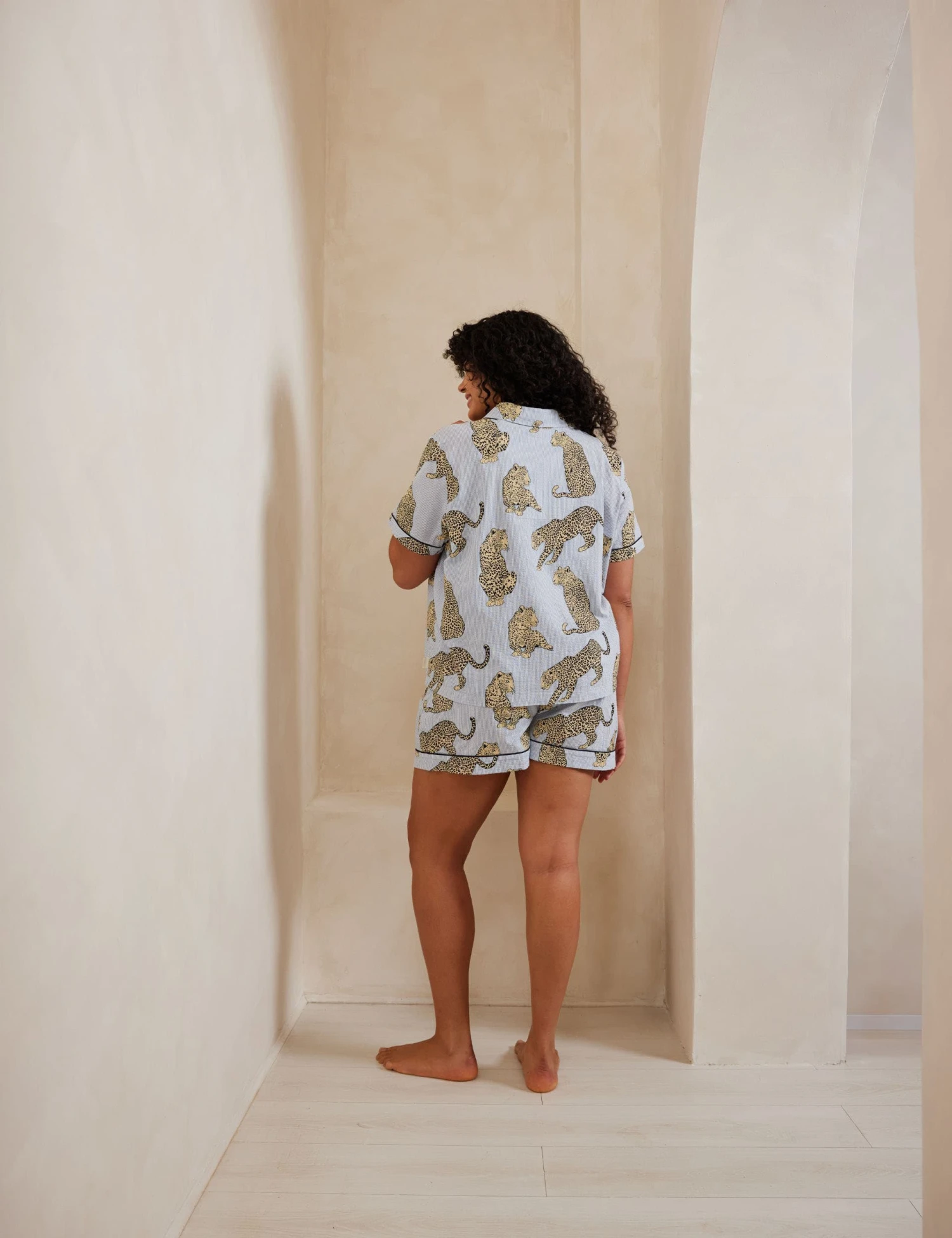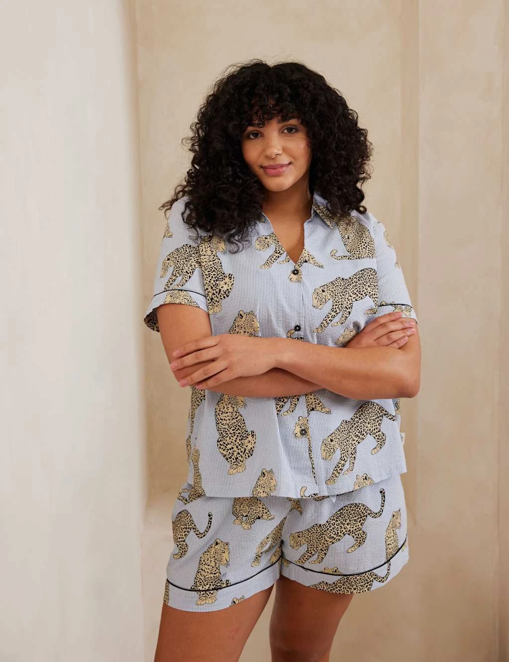 Bring a tropical vibe to your nights with these pure cotton seersucker pyjamas from Chelsea Peers, decorated with graphic leopards. This regular-fit set includes a button-up shirt with short sleeves, a revere collar and a chest pocket. An elasticated waist on the matching shorts completes this luxe co-ord.
