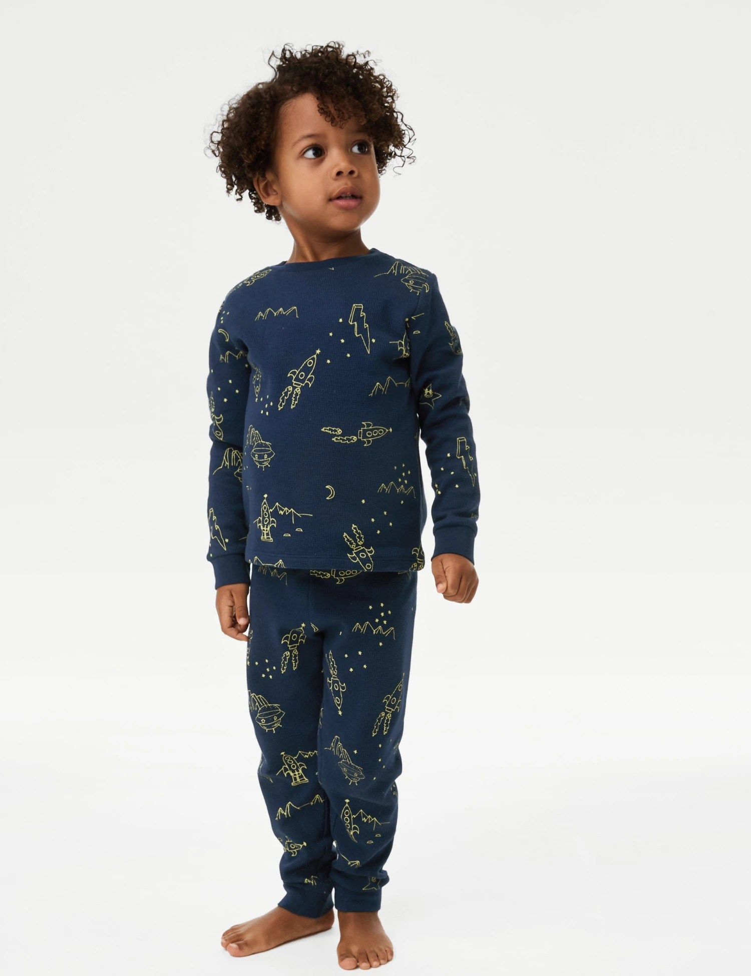 Bring an out-of-this-world feel to bedtime with these pure cotton pyjamas. Made in a comfy regular fit, the long-sleeved top and matching full-length bottoms are perfect for cooler nights. Featuring an all-over space print.