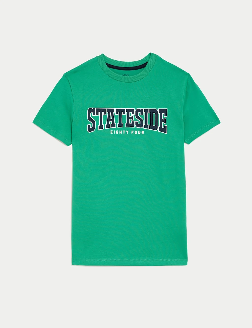 This pure cotton t-shirt is a cool, casual piece to wear after school. Designed in a regular fit with a classic round neck. It features a ‘Stateside’ slogan on the chest in a varsity-style font.