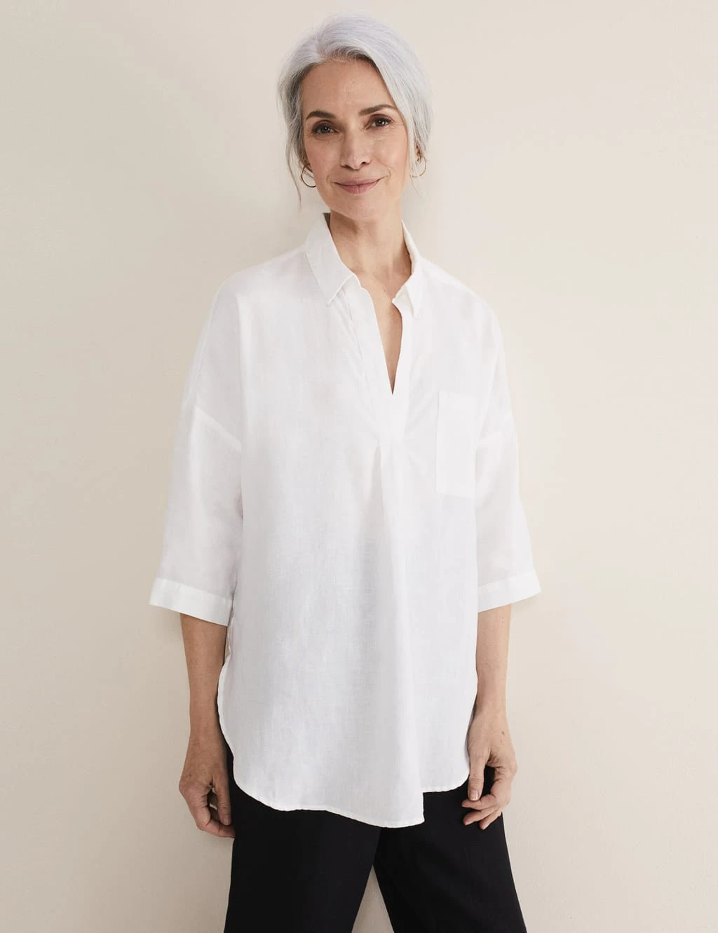 Keep your cool on warmer days in this pure linen shirt from Phase Eight. It’s made in a flowing relaxed fit, with dropped shoulders and a longline bodice for an unstructured look. The sleeves are cut at a flattering three-quarter length, while the v-neckline is finished with a smart collar. On the chest, a patch pocket adds neat detail. Side splits in the curved hem ensure easy movement.