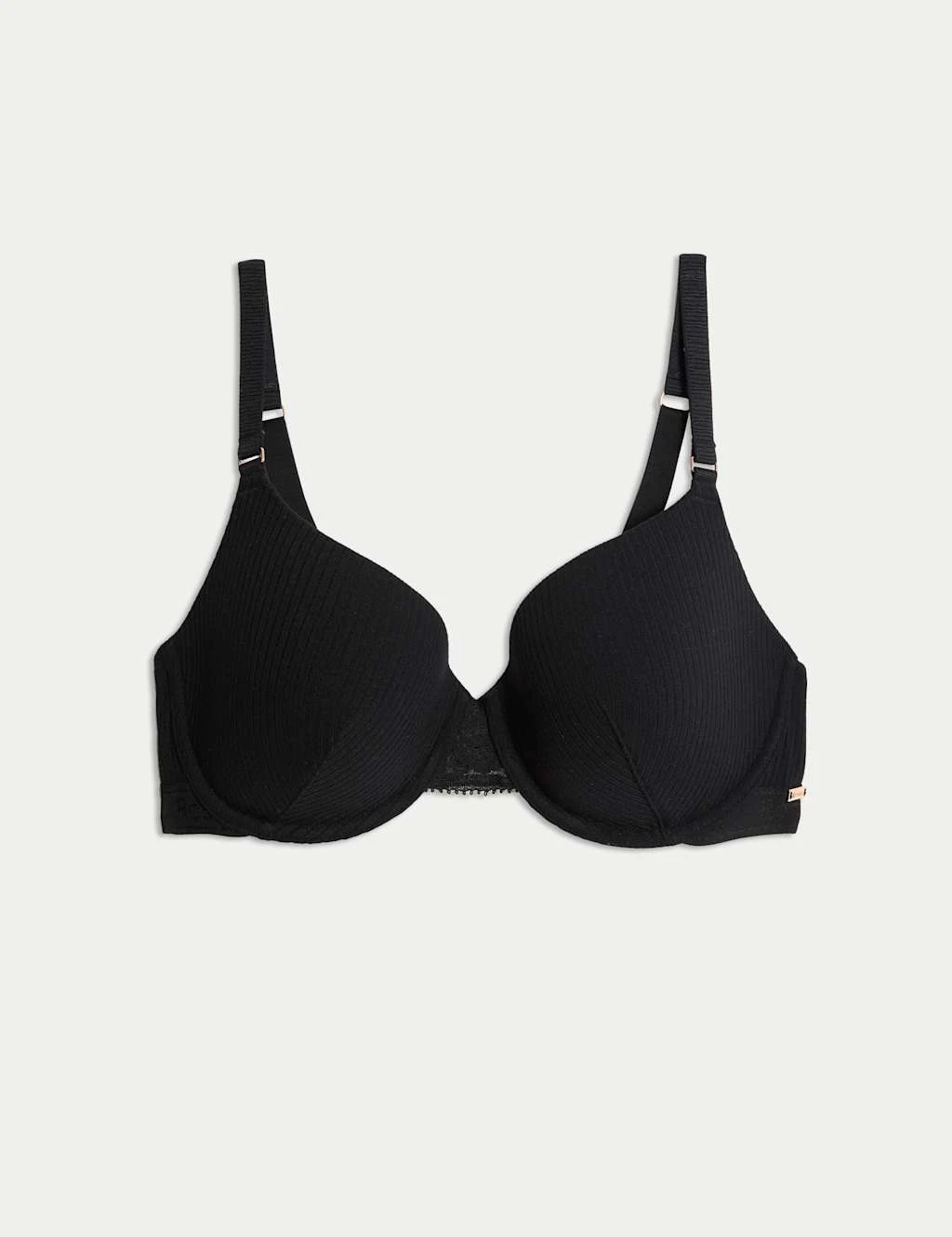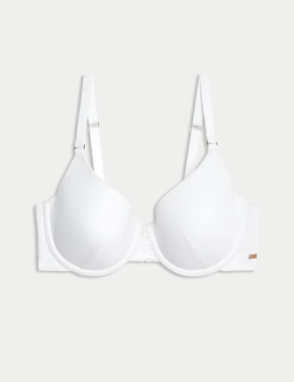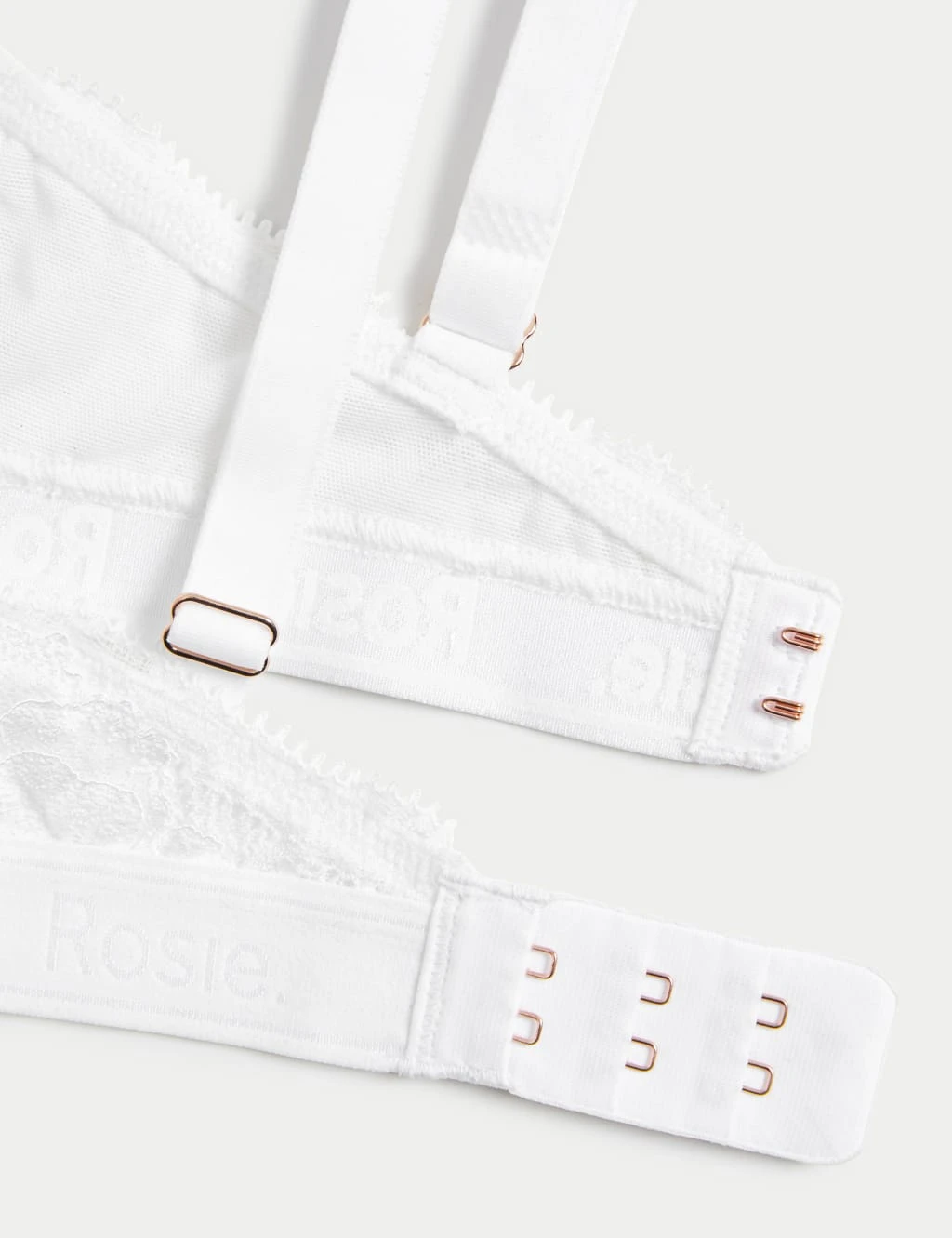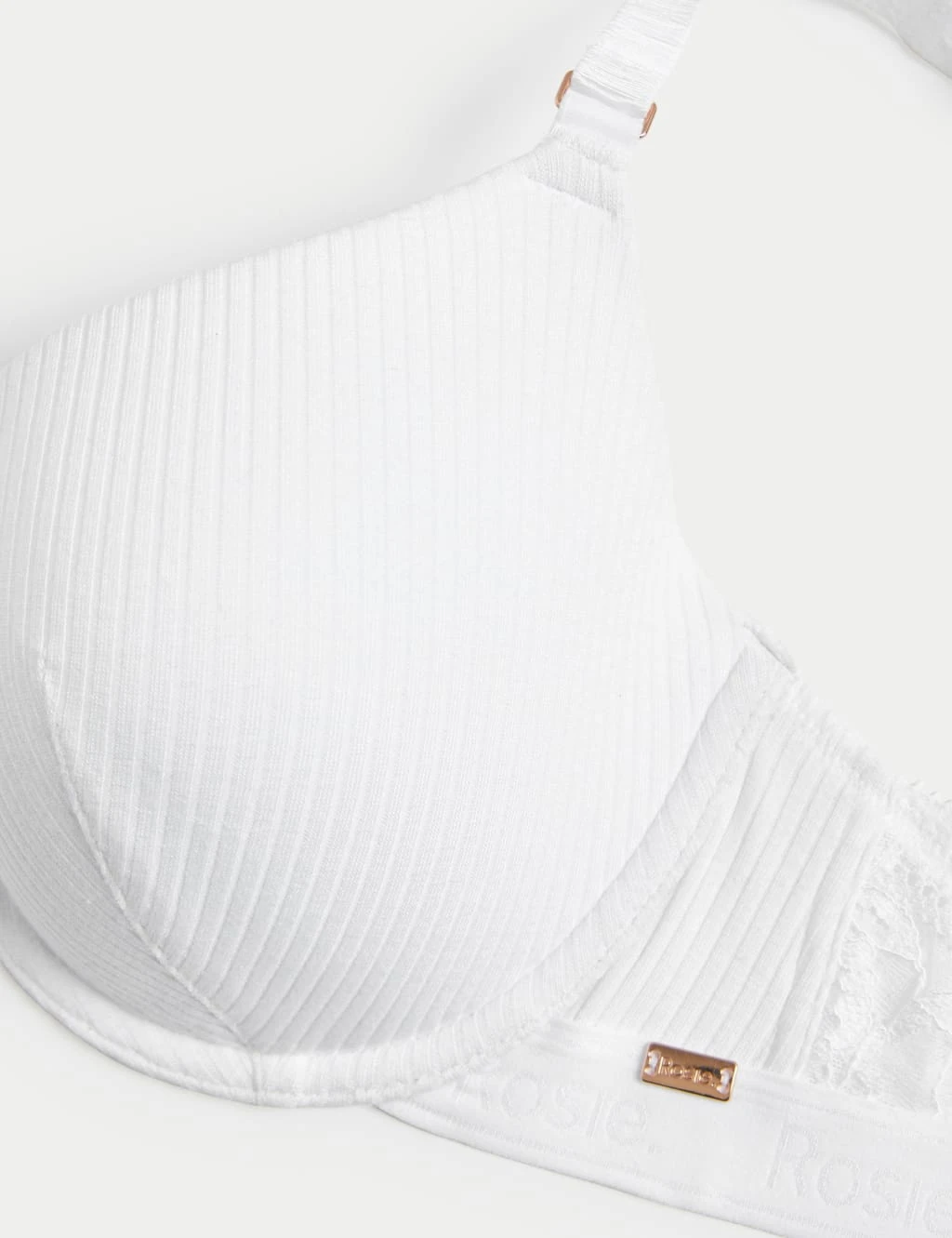 Bring extra luxe to your downtime with this lounge bra, designed by Rosie Exclusively for M&S. It’s made in a full-cup style for good coverage, with padding for a smooth look and supportive underwiring. The soft ribbed fabric is complemented by French-designed lace panels and branded elastic at the underband. Exclusively designed signature rose gold hardware adds a premium finishing touch. Rosie: contemporary, feminine silhouettes crafted from luxurious fabrics with intricate detailing.