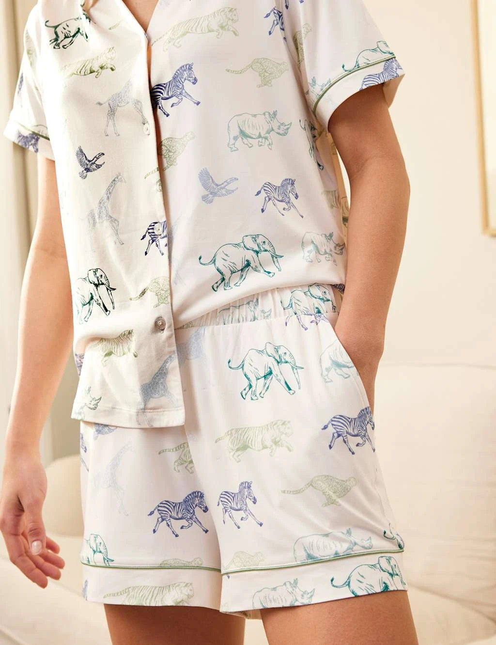 Bring a playful look to your nightwear with this Chelsea Peers shortie set, featuring a hand-drawn print of safari animals. Made in an easy regular fit, it includes a short-sleeved shirt with a collared v-neckline and branded buttons. Matching shorts have a comfy elasticated waist and handy pockets.