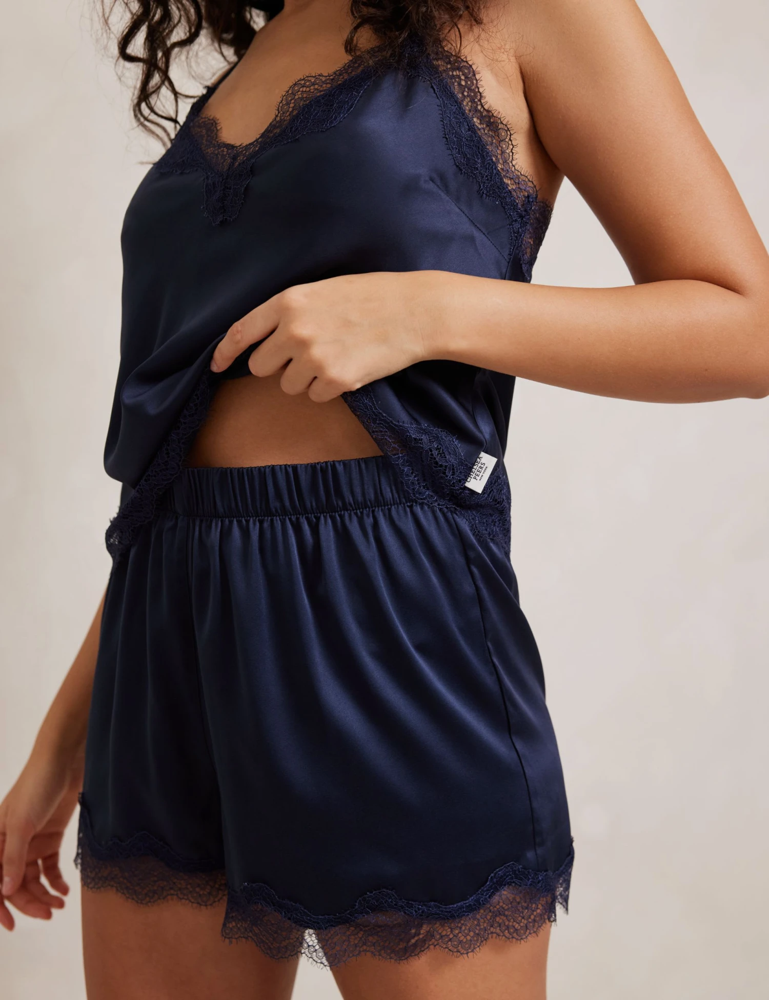Bring a luxurious feel to your nightwear with this satin pyjama set from Chelsea Peers. Designed in a regular fit, it includes a camisole top and matching shorts, both featuring intricate lace trims for a delicate touch. The cami has adjustable straps, while the elasticated waist on the shorts provides flexible comfort.