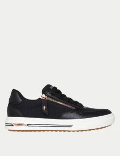 These Skechers trainers are a comfortable choice for busy days. The breathable textile upper has a front zip fastening for easy on and off, plus a padded collar for extra comfort. They’re set on a chunky sole with cushioned Arch Fit technology that moulds to your foot to give you stability and support.