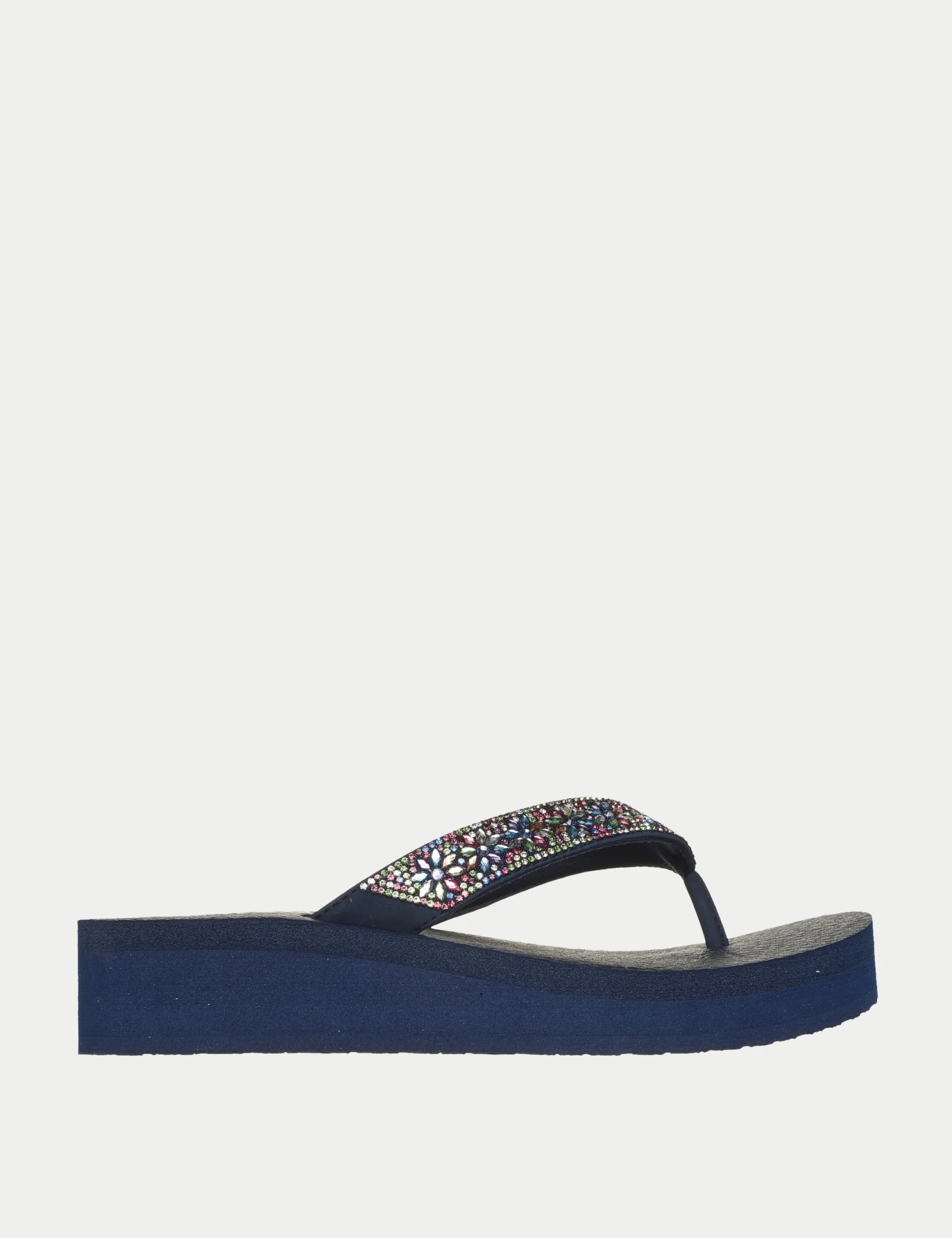 Put your best foot forward and step out on balmy days in these Cali® Vinyasa Wild Daisies flip flops from Skechers. This slip-on style features flower-patterned rhinestone detailing on the uppers for a pretty look. Chunky wedge heels with a cushioned Yoga Foam® comfort footbed ensure a light, bouncy feel.