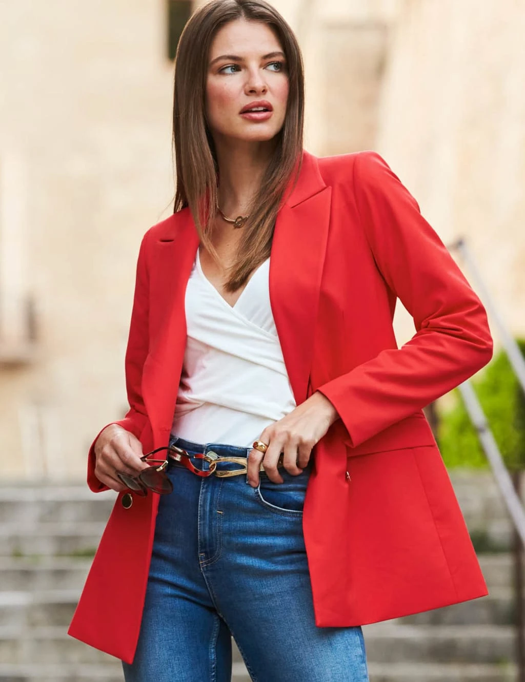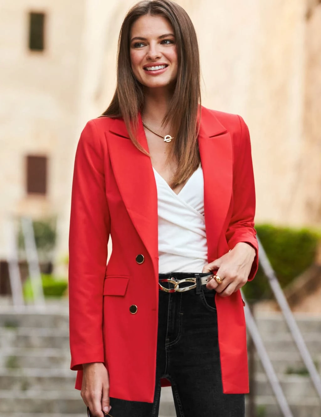 This lined tuxedo blazer from Sosandar makes power dressing easier than ever. It’s cut to a flattering slim fit and falls to a longline length for a feminine silhouette. The double-breasted style is complete with gold-toned button fastenings that add a touch of glamour.