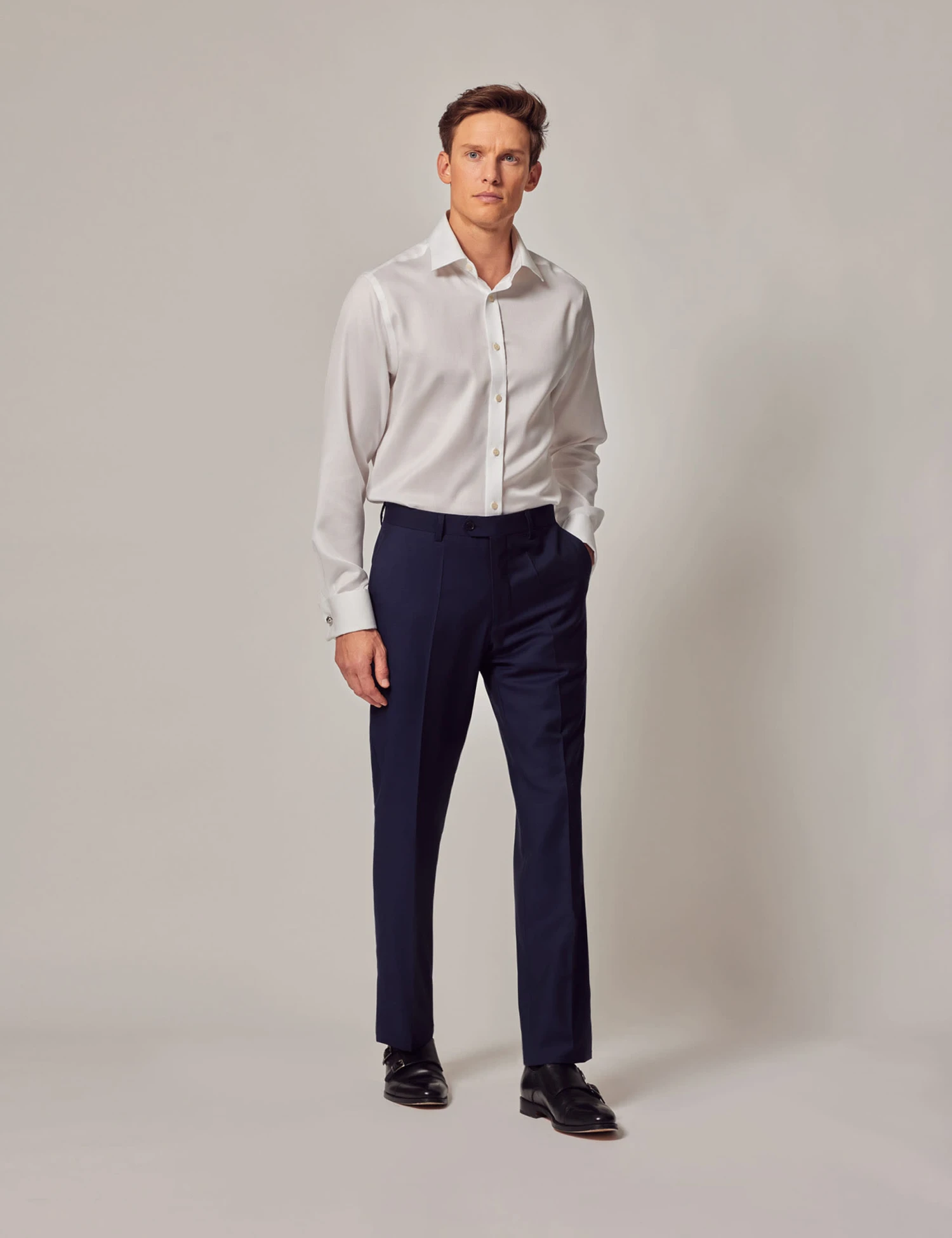 Crafted from durable wool twill fabric, these trousers from Hawes & Curtis make a timeless addition to your formal clothing collection. They come in a stylish slim fit, with two practical side pockets and a sharp front crease for an extra smart touch. The pair is lined for comfort and secures with a button and zip fastening.