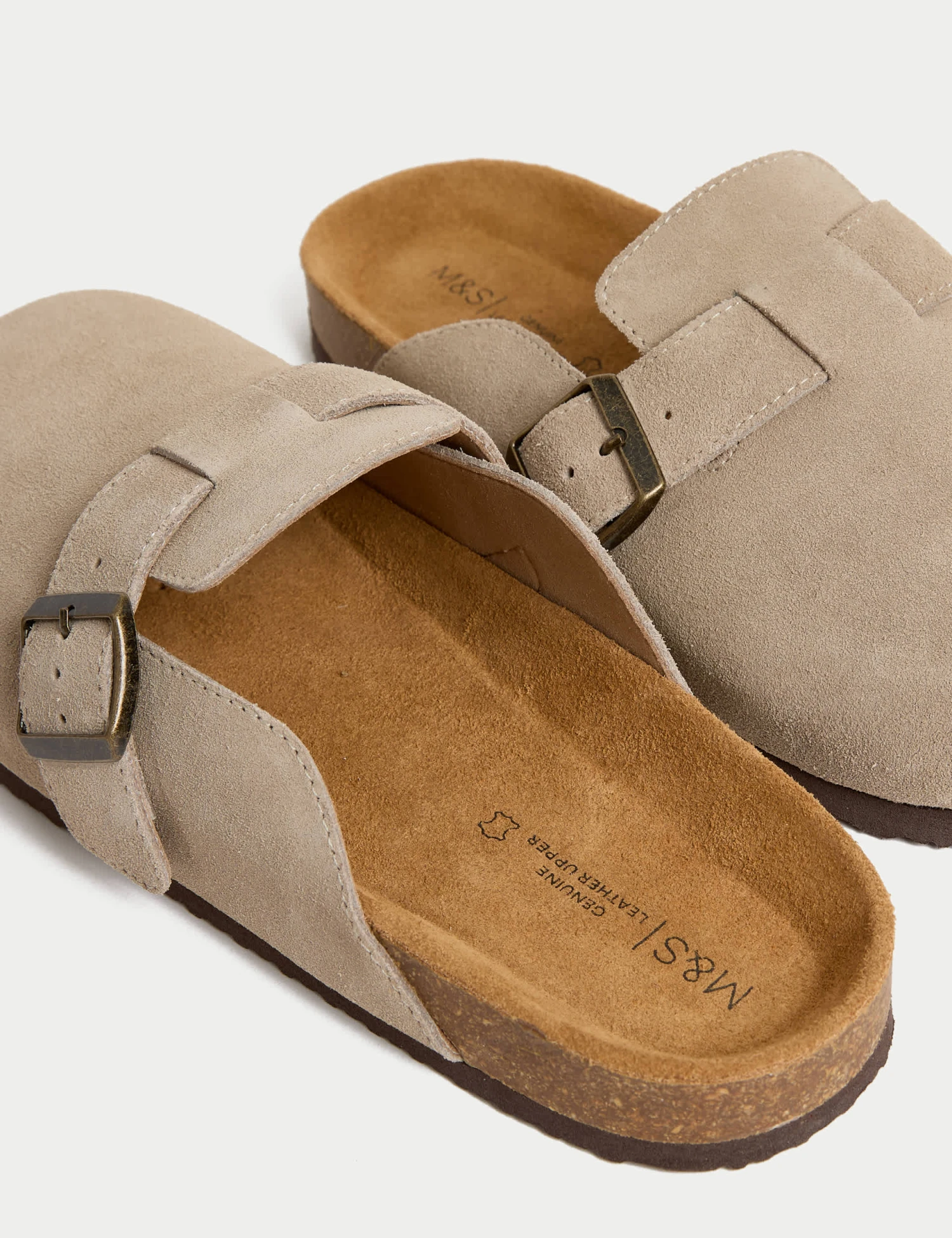 Keep your feet comfy with these suede mules. They’re designed with a closed-toe upper featuring a single buckled strap. A corkbed sole provides lightweight and flexible support, while a stain-resistant finish helps keep them looking good as new.M&S Collection: easy-to-wear wardrobe staples that combine classic and contemporary styles.
