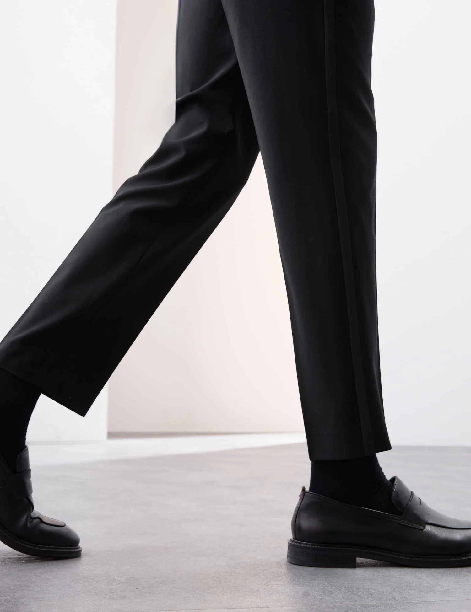 Go for a sleek evening look with these wool-blend tuxedo trousers from our Autograph range. They’re made to a tailored fit and feature a 360° flexible waistband and added stretch for easy movement. The fabric is shower-resistant and crease-resistant, so you can stay looking smart. Two side pockets add a handy touch, while a hook bar and zip fastening and a flat front complete the design. This piece is lined for a smooth drape. Autograph: premium investment pieces featuring contemporary cuts and refined finishing touches.