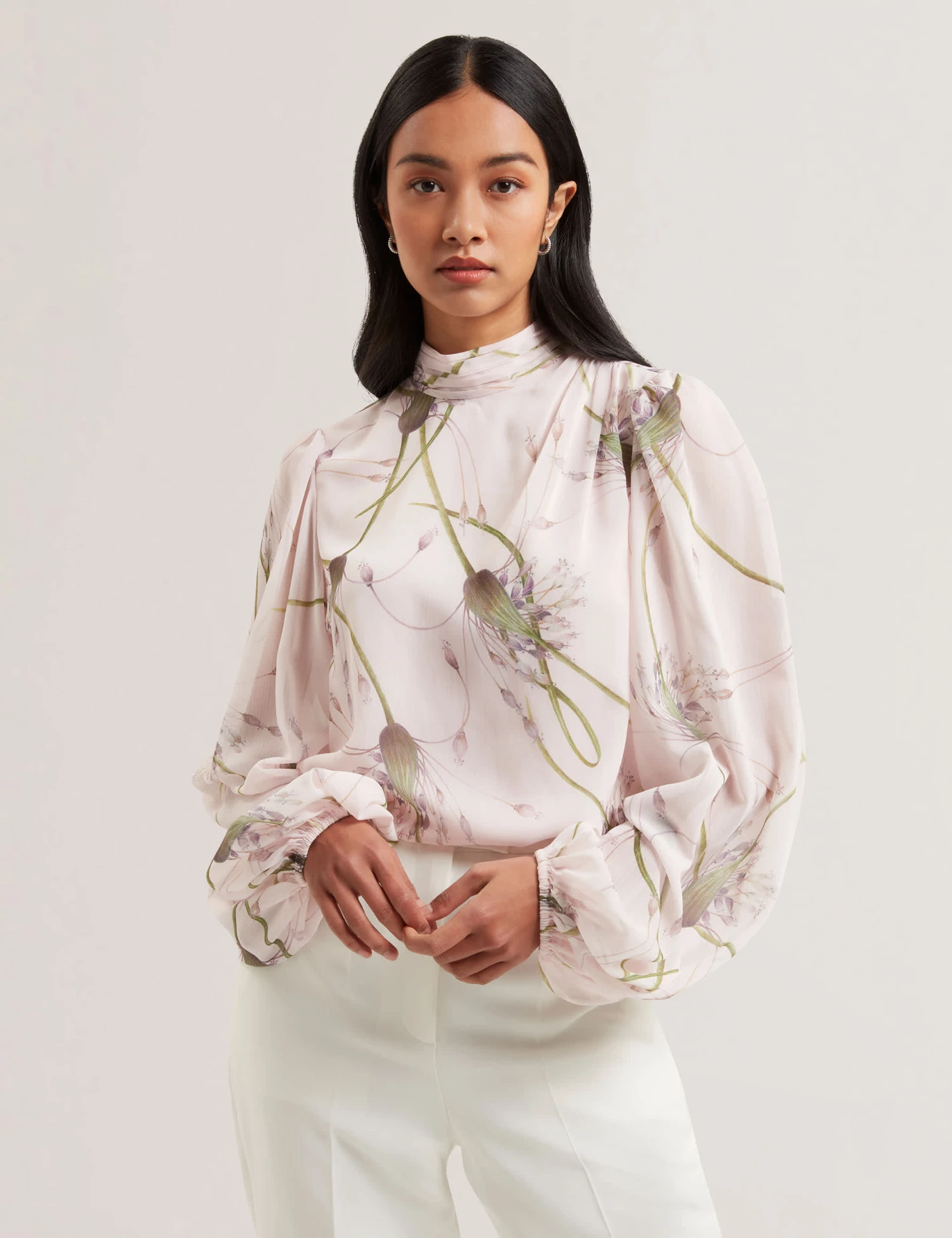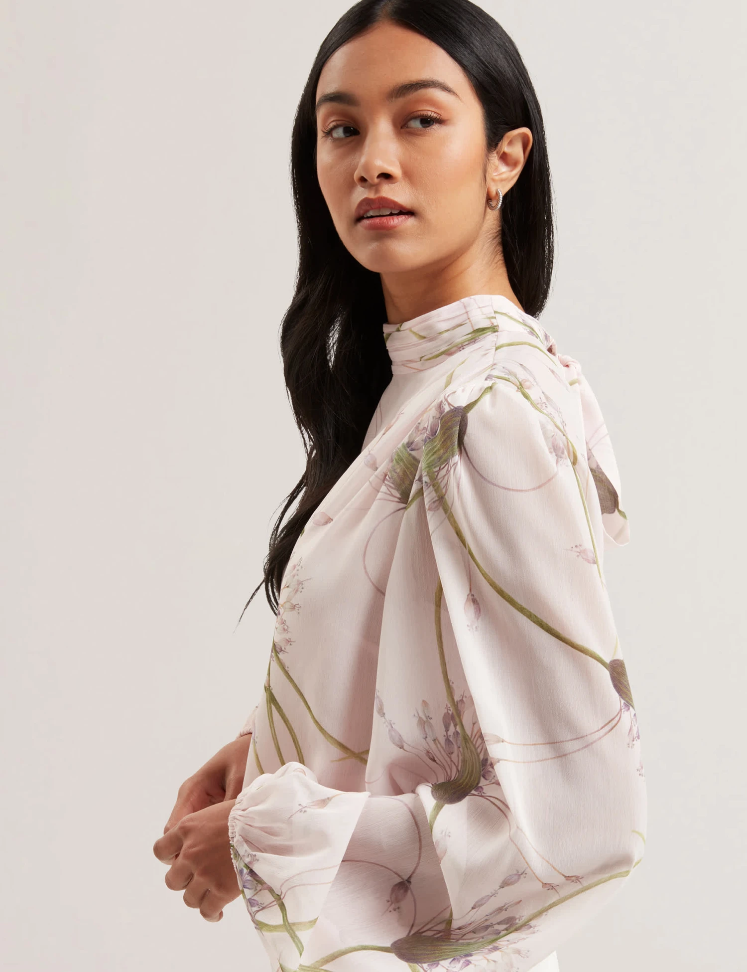 Bring a romantic feel to your ensemble with this floaty blouse by Ted Baker, printed with flowers and sweeping stems. It’s cut in a regular fit, with full balloon sleeves that add feminine volume. A tie fastens into a bow at the back neck.
