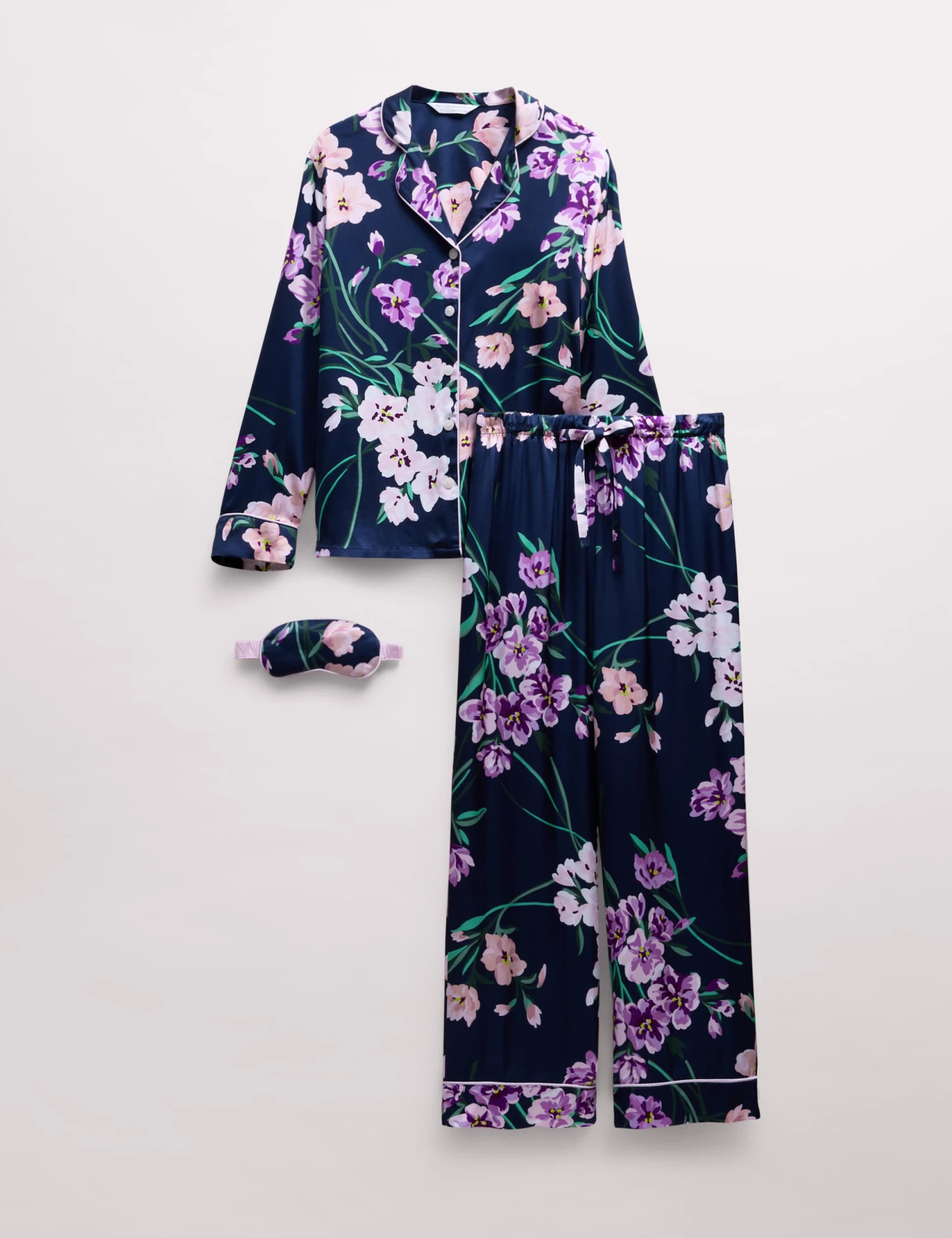 Turn downtime into a decadent affair with these M&S x Olivia von Halle pyjamas, featuring a statement-making sweeping floral print. The regular fit set comprises a revere collar shirt and wide-legged bottoms, both with elegant deep cuffs. An elasticated drawcord waist ensures easy comfort, while the lustrous fabric offers a luxuriously smooth drape. Contrast piping and branded buttons provide sophisticated final touches.
