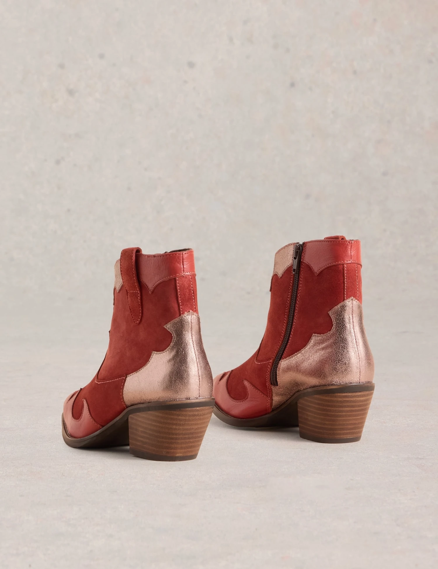 Bring a striking finishing touch to your looks with these leather ankle boots by White Stuff. The smooth uppers feature a statement patchwork design, including metallic and suede detailing, and are set on a low block heel for comfortable wear. A zip fastening on the inner foot makes for easy on and off.
