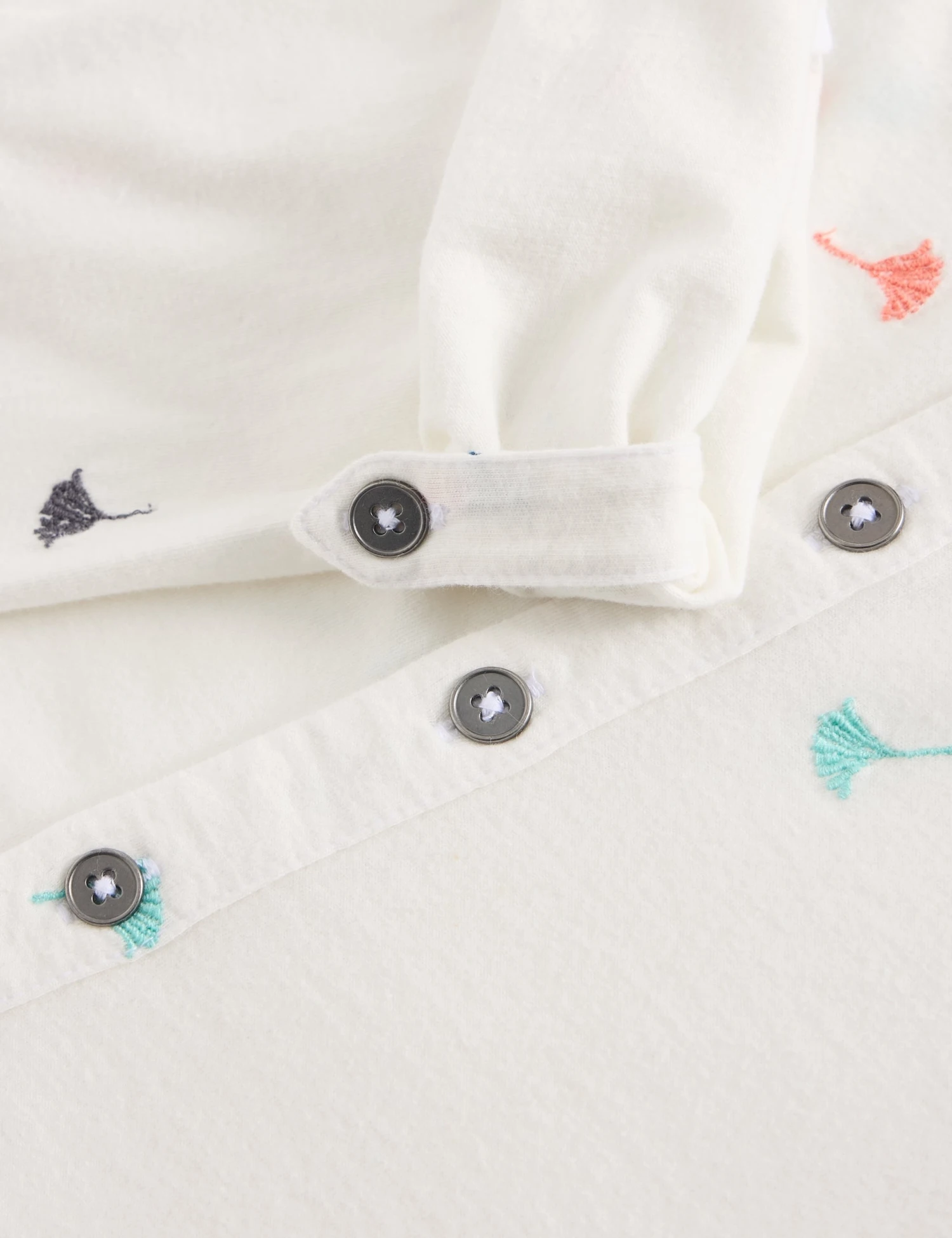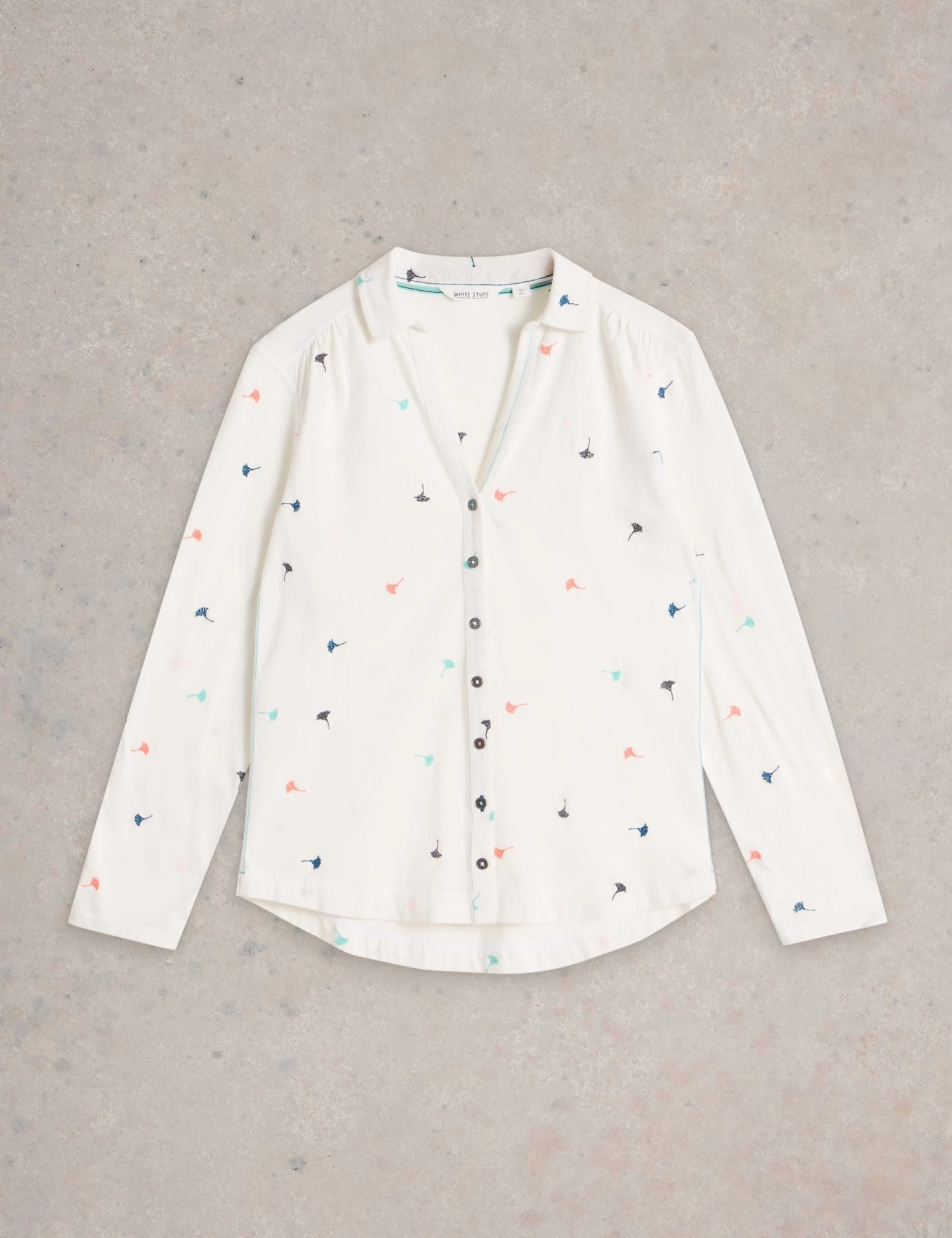 This jersey shirt by White Stuff is crafted from pure cotton for a soft, breathable feel. It’s designed in a regular fit, with three-quarter sleeves and a flattering curved back hem. The button-through front and collar give it a smart look. A pretty embroidered pattern and contrast stitching add a playful flourish.