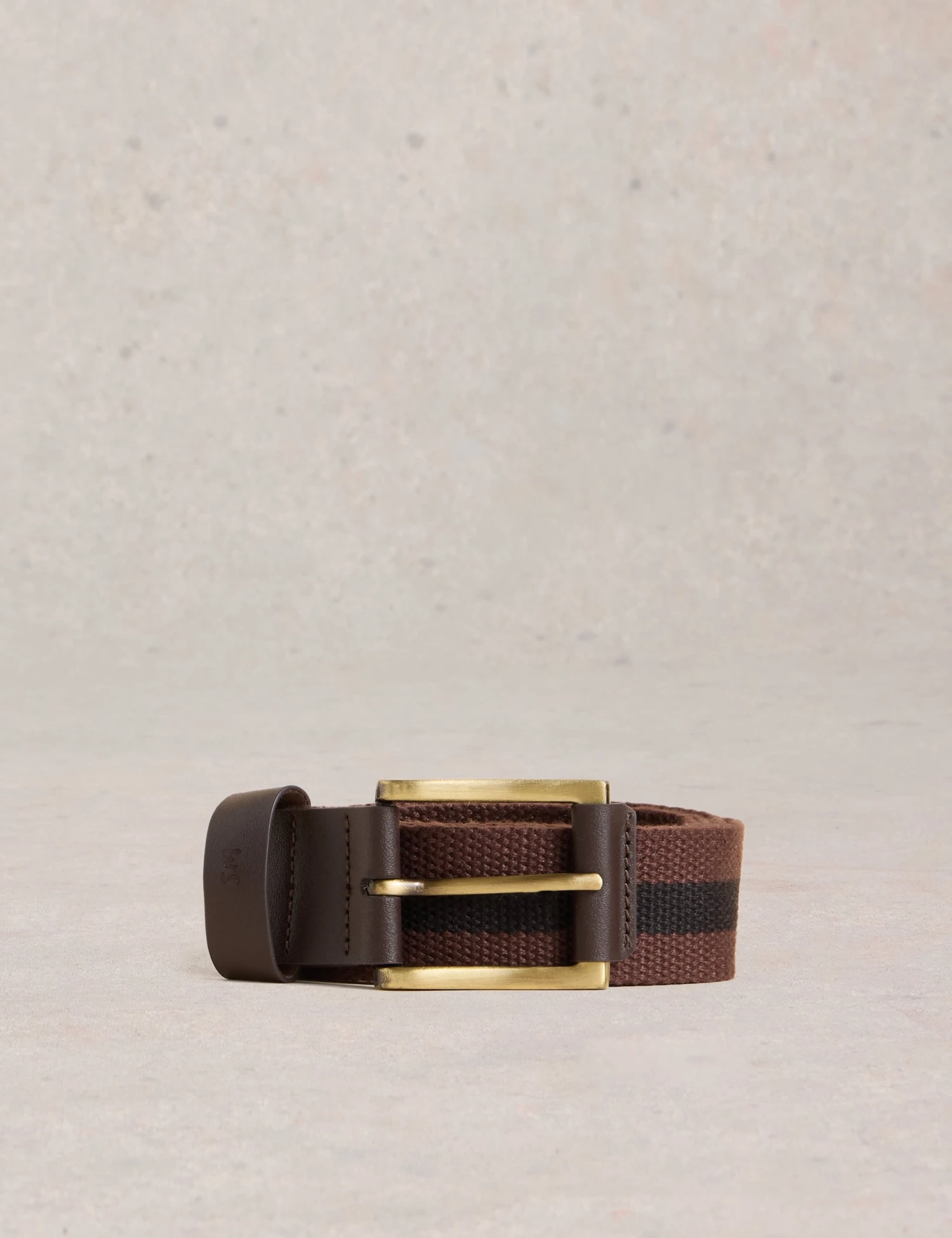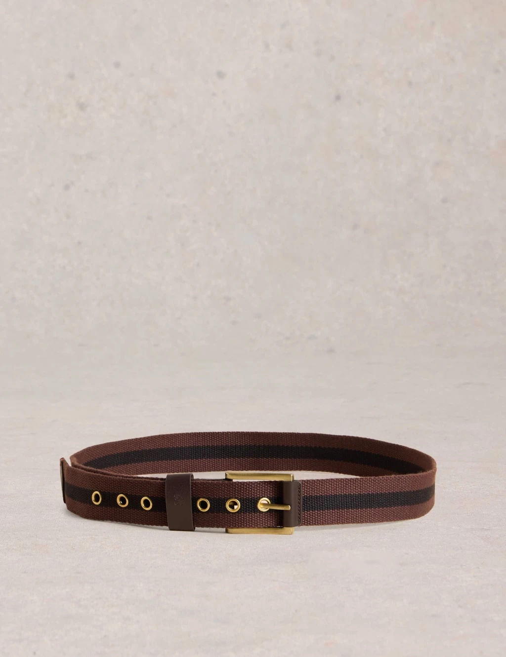 With its bold combinations of rich tones, this striped webbing belt from White Stuff adds a distinctive touch to casual outfits. It fastens securely with a brass buckle and is crafted with coordinating eyelets and leather accents.