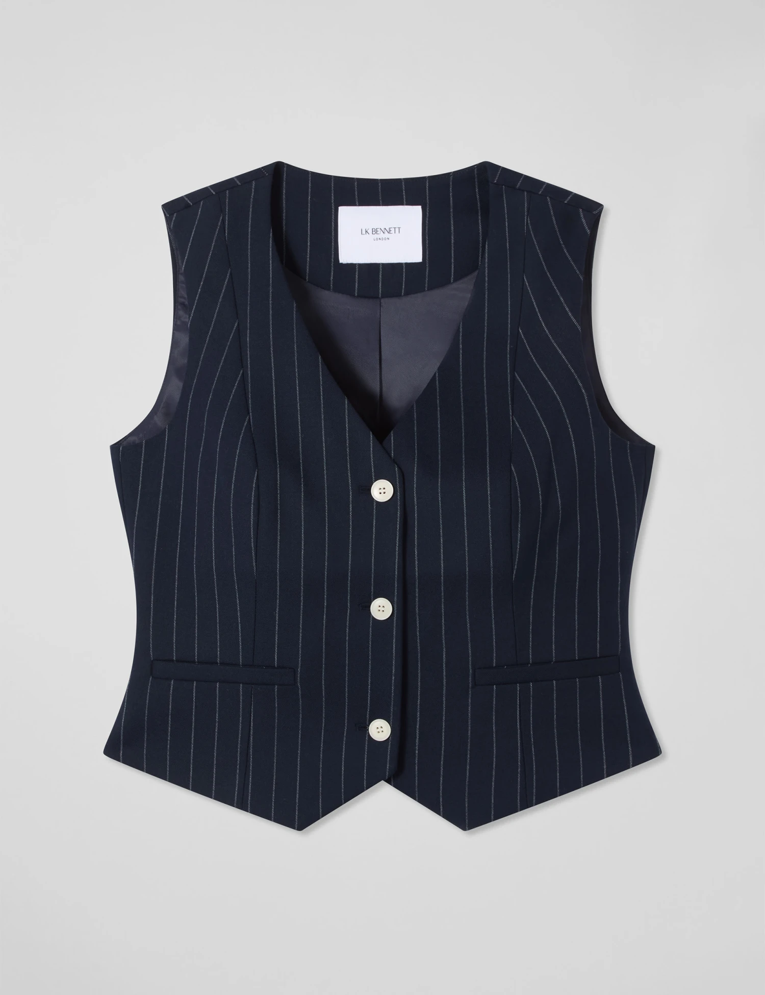 Add a touch of sophistication to your workwear wardrobe with this wool-blend waistcoat from LK Bennett. It’s made in a regular fit with a cropped length and a timeless v-neckline. Pinstripes, welt pockets and darts create a tailored aesthetic. Three horn-effect buttons add contrasting detail to the front.